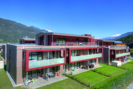 Die Wohnanlage „Wirtsgründe II“ liegt an der östlichen Ortseinfahrt von Flaurling und umfasst insgesamt vier Baukörper. Die Gebäude bilden ein Ensemble, das sich gut in die Umgebung einfügt und in dem alle 24 Wohnungen nach Süden oder Westen orientiert sind. Holzbautechnisch wurden die horizontalen Bauteilelemente in Massivholzbauweise und die vertikalen Bauteile in Riegelbauweise geplant. Die Möglichkeiten der Vorfertigung im Holzbau zeigen sich in den zur Ausführung gelangten Wand- und Deckenelementen. Die Außenwandbauteile wurden bereits mit eingebauten Fenstern und aufgebrachter Holzfassadenschalung angeliefert und montiert. Hervorzuheben ist auch die Ausführung im Passivhausstandard laut Tiroler Wohnbauförderung mit einer Energiekennzahl von 8,6 bis 9,8 kWh⁄ m2a. Dieser bemerkenswert niedrige Heizenergieverbrauch zeigt in Kombination mit der Holzbauweise einen Weg in eine engagierte, zukunftsorientierte Wohnungspolitik für den mehrgeschossigen Wohnungsbau. Mit der CO2-reduzierten Bauweise ist die Wohnanlage beispielhaft für das Streben nach Einhaltung der Klimaschutzziele.