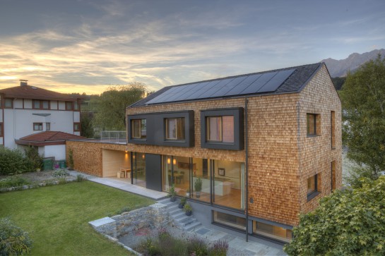 Man merkt dem Haus an, wie viel Sorgfalt auf dessen Planung und Ausführung aufgewendet wurde. Die Konstruktion besteht aus Massivholzelementen, die im Wand-, Decken- und Dachbereich großteils sichtbar sind. Die Außenhülle ist mit Cellulose gedämmt, der Witterungsschutz der Außenhaut inklusive des Steildachs erfolgt durch Lärchenschindeln. Damit kann weitestgehend auf Bitumen und Blech als Witterungsschutz verzichtet werden. Bei der Gestaltung der Innenräume werden die heimischen Holzarten ihren unterschiedlichen Eigenschaften entsprechend eingesetzt: Die weiß pigmentierten Fichtenoberflächen der Massivholzelemente werden durch glatte Oberflächen im Eingangs- und Küchenbereich und schallschluckende Filzoberflächen unterbrochen. Im Schlaf- und Badebereich sowie bei der Terrasse wird heimisches Zirbenholz verwendet. Bei so viel bewusstem Umgang mit natürlichen Ressourcen verwundert es nicht, dass auch die Lage des Bauplatzes mit Bedacht gewählt ist – oder ist es nur Zufall, dass bei einem Häuschen im Grünen die Straßenbahnhaltestelle nur wenige Schritte entfernt ist und damit auch die ressourcenschonende Mobilität für die Bewohner gesichert scheint? Wenn Tirol das ambitionierte Ziel der Energieautarkie bis 2050 erreichen will, sind derartige Bauwerke nötig, die zeigen, dass Energieeffizienz und die Verwendung erneuerbarer Baumaterialien nicht mit Verzicht und Komfortverlust einhergehen müssen.