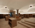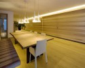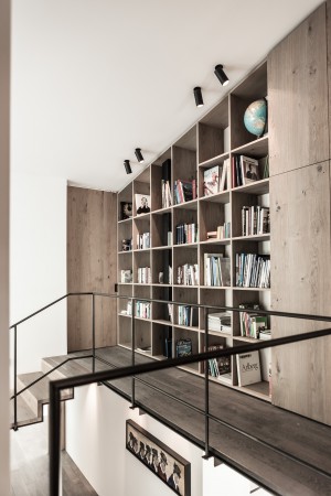 Zentrales Möbel für dieses Projekt ist die Innentreppe, die die unterschiedlichen Ebenen mit verschieden Nutzungen und Atmosphären verbindet. Die Treppe bildet einen in sich geschlossenen Körper, ist über flächenbündige, gebogene Türen betretbar und erstreckt sich über vier Geschoße. Die wild gefladerten Seekieferplatten, gebogen und gewendelt, verwirren beim Begehen und irritieren den Benutzer, um ihn dann wieder frei zu geben und in eine andere Ebene zu entlassen.