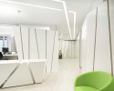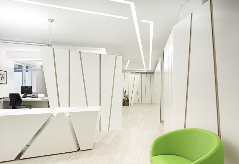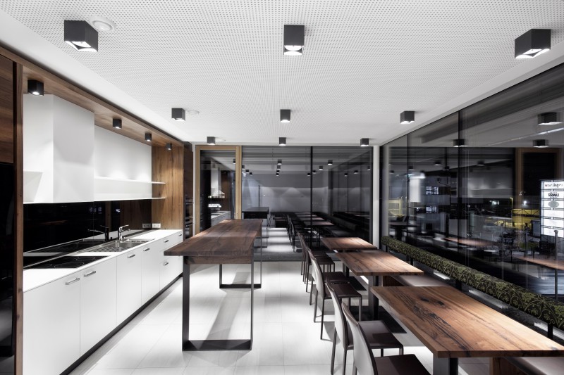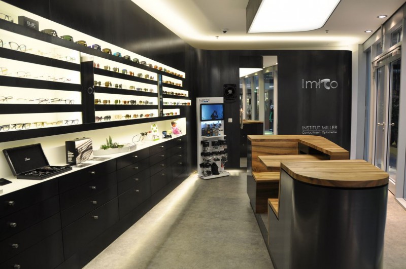 Das architektonische Konzept besteht aus einem durchlaufenden meanderförmigen, schwebenden Band aus Schwarzstahl, welches sämtliche Funktionen des Contactlinseninstitutes durchläuft und somit spielerisch miteinander verbindet. Im verbleibenden zentralen Raum sind zwei Solitärkörper aus Schwarzblech und hochwertigem Walnuss-Vollholz situiert – einmal der Kassa- und Informationsbereich und einmal die Beratungszone für den Brillenpräsentationsbereich. Bereits in der Planungsphase wurde auf die Erfahrung von regionalen Handwerksbetrieben zurückgegriffen und verschiedenste Details gemeinsam entwickelt.