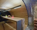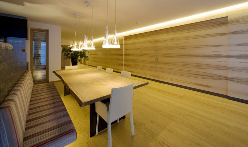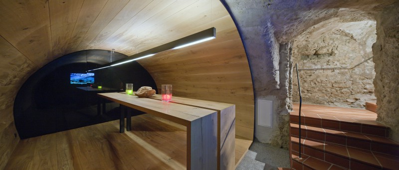 Bei der Innenraumgestaltung wurde bewusst mit kontrastreichen Materialien wie einheimischem Holz, Naturstein, Granit oder Glas gearbeitet. Der zeitlose Stil stellt die Natur in den Mittelpunkt. Das Architekturbüro Gogl aus Lans bei Innsbruck zeigt sich neben der Planung des Gebäudekomplexes auch für die komplette Innenraumgestaltung inklusive der Möblierung verantwortlich. In enger Zusammenarbeit mit der Tischlerei Hofer aus Gramastetten (OÖ) wurden unzählige Möbel und Einzelteile individuell entworfen, die mit viel Liebe zum Detail Funktionsabläufe optimieren und der Innenausstattung ihre harmonische und edle Gesamtwirkung verleihen. Verwendet wurden Eichen- und Walnussholz mit verschiedenen Oberflächenbehandlungen - gebeizt, gebürstet, lackiert. Auf Gehrung geschnittene Kanten und zarte Metallgriffe betonen die reduzierte Eleganz der Einzelstücke. Neben dem Herzstück des Hauses, dem Restaurant- & Barbereich, wurden auch der Wellnessbereich und die Zimmer des Hauses ausgestattet.