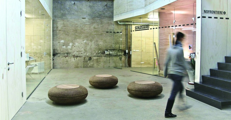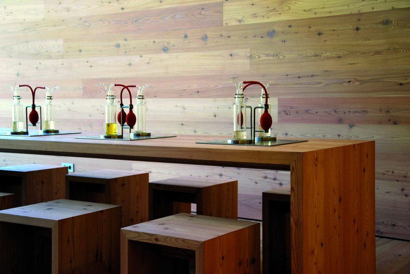Wie Flechten im kargen Hochgebirge finden sich Stickmuster aus Kleeblättern, ein Verweis auf die Anmutung traditioneller Federkielstickerei, die den ganzen Stolz des Besitzers offenlegt. Die bevorzugten Materialien sind Eiche und Buche aus Tirol, deren Verwendung den Nutzwald stärken, sowie einheimische Loden-, Leinen- und Baumwollstoffe.