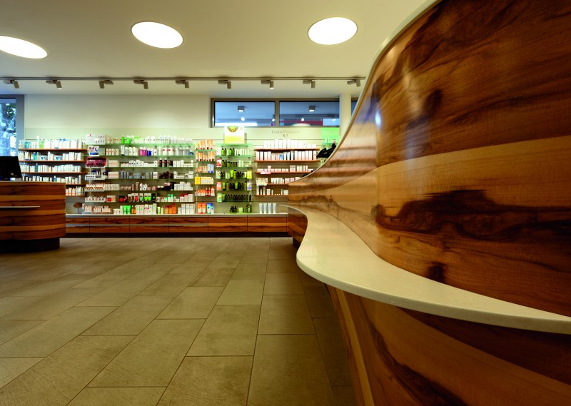Eine lichtdurchflutete Apotheke mit besonderem Charakter zu schaffen, war die Aufgabenstellung für dieses Projekt. Die geschwungenen Formen und die sorgfältige Holzauswahl geben dem Raum einen besonderen Wohlfühlcharakter. Mit der Wahl der Satin Nuss wurde ein warmes, lebhaftes Holz gefunden, welches einen unverwechselbaren Ausdruck in Farbe und Struktur vorweist. Den Kontrast bildet die pastellgrün lackierte Rückwand. Abgerundet wird der moderne Verkaufsraum mit der zielgerichteten Beleuchtung.