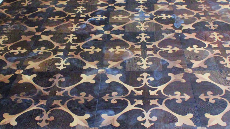 Intarsienböden erreichten im 18. Jahrhundert ihren absoluten Höhepunkt in der Innenarchitektur. Sie waren mit der Vielfalt an Ornamenten, kunstvollen Bildern und später auch mit geometrischen Mustern nur der wohlhabenden Bevölkerungsschicht vorbehalten. So schmückte man in erster Linie Schlösser und Paläste mit diesen prunkvollen Kunstwerken. Die Böden sind geschliffen und geölt ausgeführt.