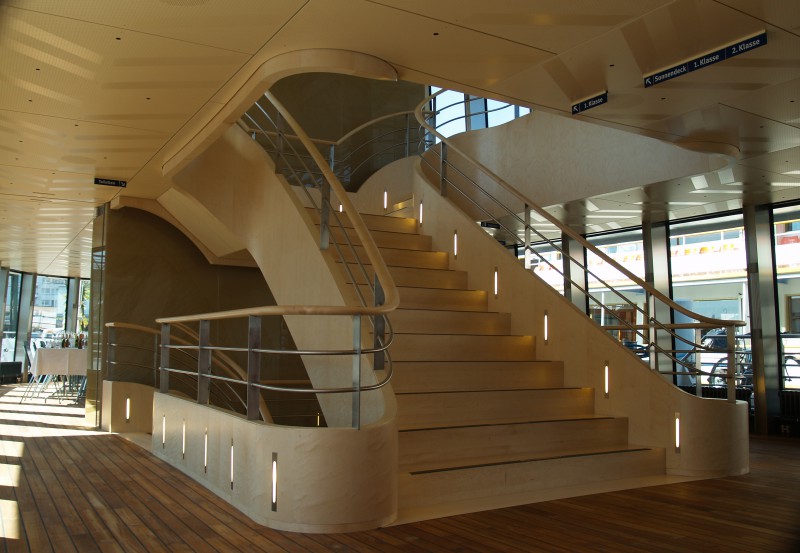 Ein wahrer Eye-Catcher ist die prachtvolle, über vier Stockwerke führende und auf höchstem handwerklichen Niveau ausgeführte Treppe. Glanzstücke im wahrsten Sinne des Wortes sind die handpolierten Lackoberflächen von Bar, Pulten und Wandverkleidungen. Jedes einzelne Stück wurde zwischen 20 und 25-mal lackiert und in reiner Handarbeit auf Hochglanz gebracht. Die gründliche Lackierung ermöglicht ein beinahe farbentreues Widerspiegeln des blauen Himmels oder grünblauen Wassers.