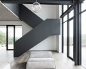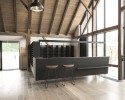 wurden verschiedene Eichenhölzer mit unterschiedlichen selbstentwickelten Oberflächenbehandlungen – gebeizt, gebürstet, geölt. Das Hauptmaterial der Möblierung ist anthrazit gebeiztes Plywood. Auf Gehrung geschnittene Kanten und zarte Metallgriffe betonen die pure Eleganz der Einzelstücke.