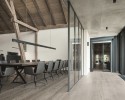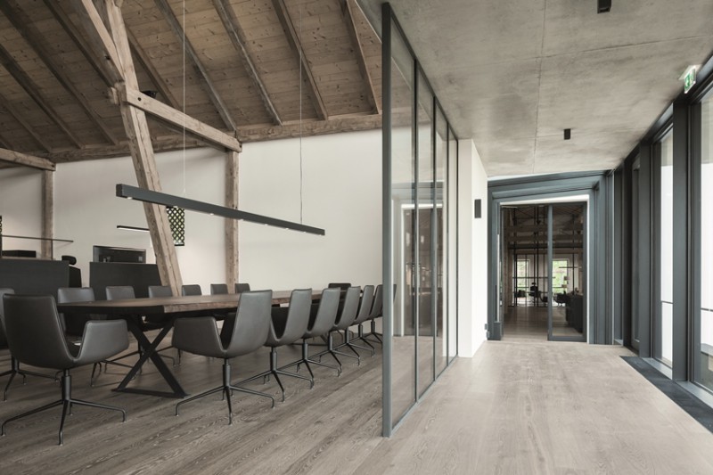 Das Beleuchtungskonzept, welches sowohl die Gesamtraum- als auch die Arbeitsplatzbeleuchtung umfasst, ist integraler Bestandteil des Gesamtkonzepts und nicht nachträglich appliziert. Dies vermittelt Ruhe und verschafft der offenen Dachkonstruktion die gebotene Aufmerksamkeit.