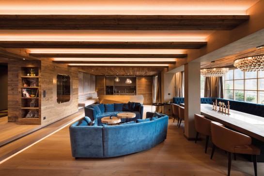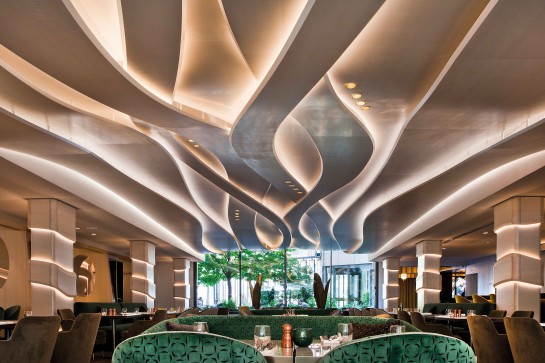 Die prominent eingesetzte, skulpturhaft anmutende Decken und Wandgestaltung dominiert den Raum. Unterstützt durch integrierte Leuchtkörper, wird die organische Struktur und deren eigenständiger Charakter verstärkt. Die Raumskulptur zieht sich von außen in den Innenraum, was hinsichtlich ihrer Ausführungsqualität höchste Ansprüche erfüllt. Aufwendig gefertigte Einzelteile – durchwegs 3DBaukörper – verschmelzen fast organisch anmutend zu einer Einheit oder anders gesagt zu einem Gesamtkunstwerk. Gefräst mit modernster CNCTechnik wird eine neue Stufe an Komplexität ermöglicht.
