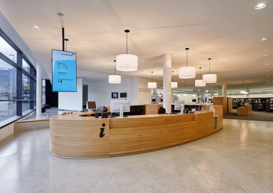 Das mit seinen Ausmaßen von 5 × 9 Metern wirklich riesige Möbel, noch dazu mit ständig wechselnden Radien, ist perfekt gearbeitet. Es entstand ein Element, welches den Raum zoniert und eine klare Struktur schafft. Auch die um die Pultanlage angeordneten Trennelemente im Hintergrund sind raumhoch, gebogen und präzise ausgeführt. Der Akustik wurde viel Aufmerksamkeit geschenkt, was insgesamt so etwas wie das geheime Wohnzimmer der Stadt Innsbruck ergibt.