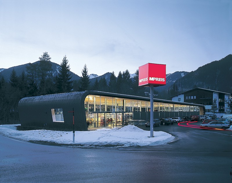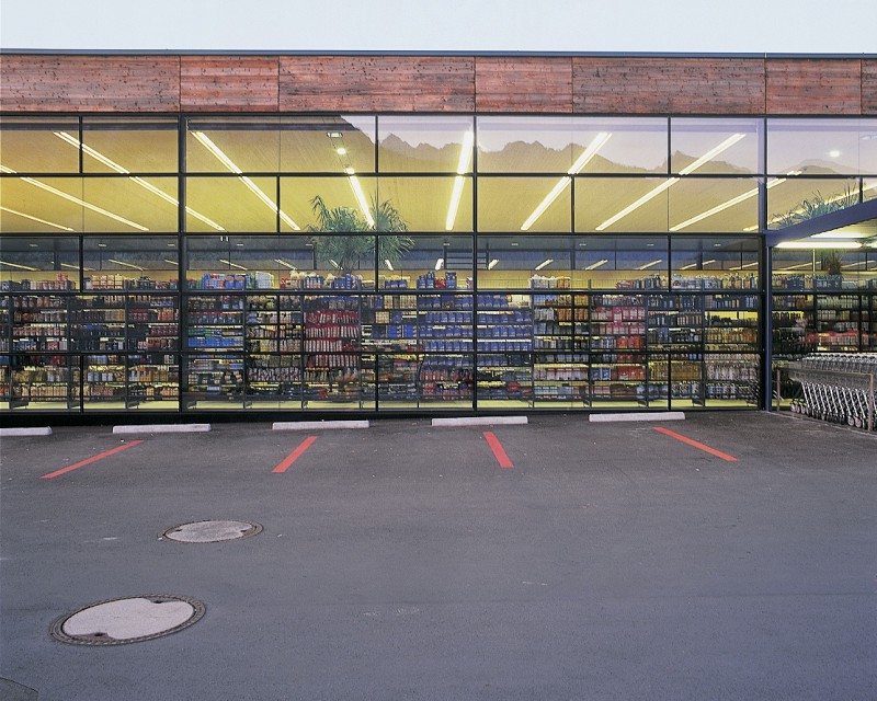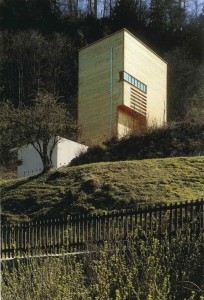 ein bemerkenswertes Unterfangen. Die Außenwände sind aus 16 cm Tannenholz. Da das Holz schwindet – seit Fertigstellung hat sich das Gebäude um 15 cm gesetzt – wurde der entsprechenden Detailausbildung höchstes Augenmerk geschenkt. Vorkehrungen wie die Ausbildung von Taschen und Überlappungen machen den Schwund möglich, ohne Schäden zu riskieren. Deshalb werden auch alle Leitungen im zentralen Betonkern geführt.