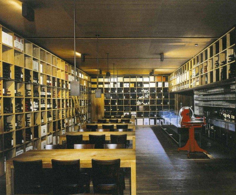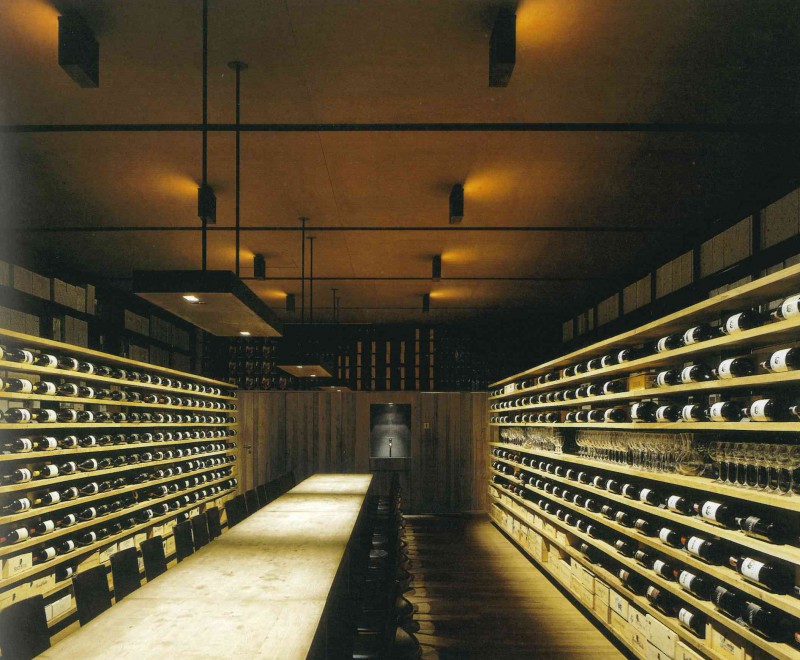 In der benachbarten Vinothek ist die Kupfereiche noch präsenter, vor allem aufgrund der Regalwände, die den Raum umhüllen. Beim Fußboden handelt es sich um einen von der Tischlerei entwickelten, schwimmend verlegten Element-Riemenboden (Stärke 23 mm). Das gesamte Mobiliar, ob die großflächigen Regalwände aus Massivholz oder die einfachen Tische, ist von einer feinen Solidität.