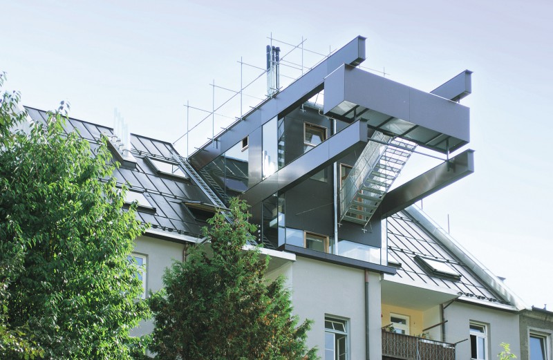 Ein steiler Felshang mit 35 Grad Hangneigung legte die Art der Bebauung nahe: einen Turm auf kleinem Grundriss, um die Fundierung möglichst sparsam gestalten zu können. Über dem Betonsockel erheben sich vier Wohngeschosse in Holzbauweise.