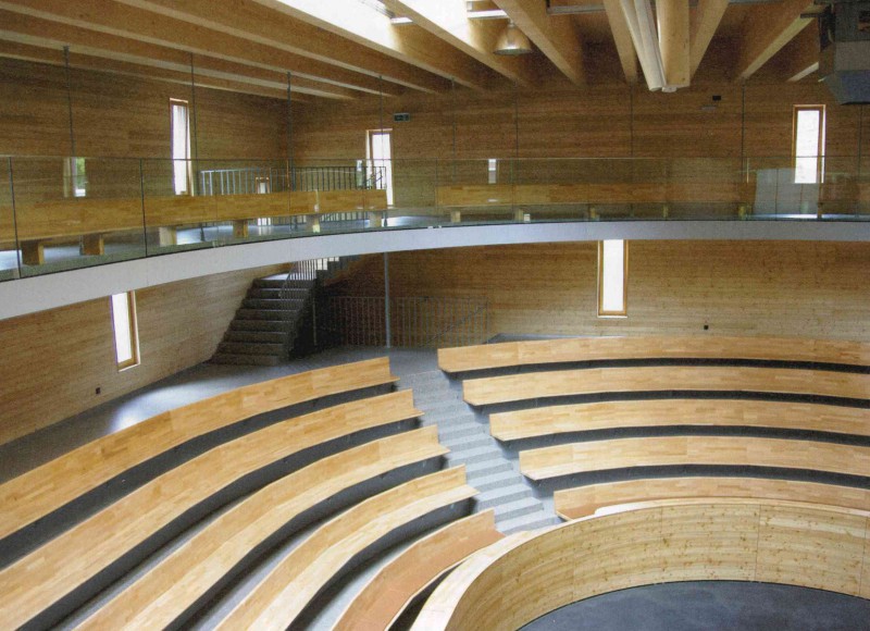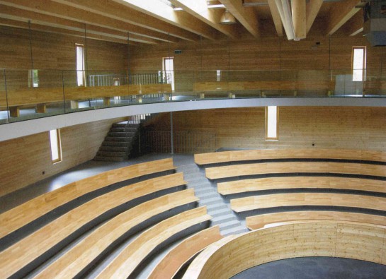 Die warme Atmosphäre des Innenraums ist durch die pure Verwendung der Hölzer (Fichtenholz für Konstruktion, Wandverkleidung und Schallreflektoren; Akazie als Bodenbelag) geprägt. Erst auf den zweiten Blick erschließt sich dem Besucher das sehr gut gelöste statische Konzept der Rahmenkonstruktion, das dieses Projekt vorrangig auszeichnet.