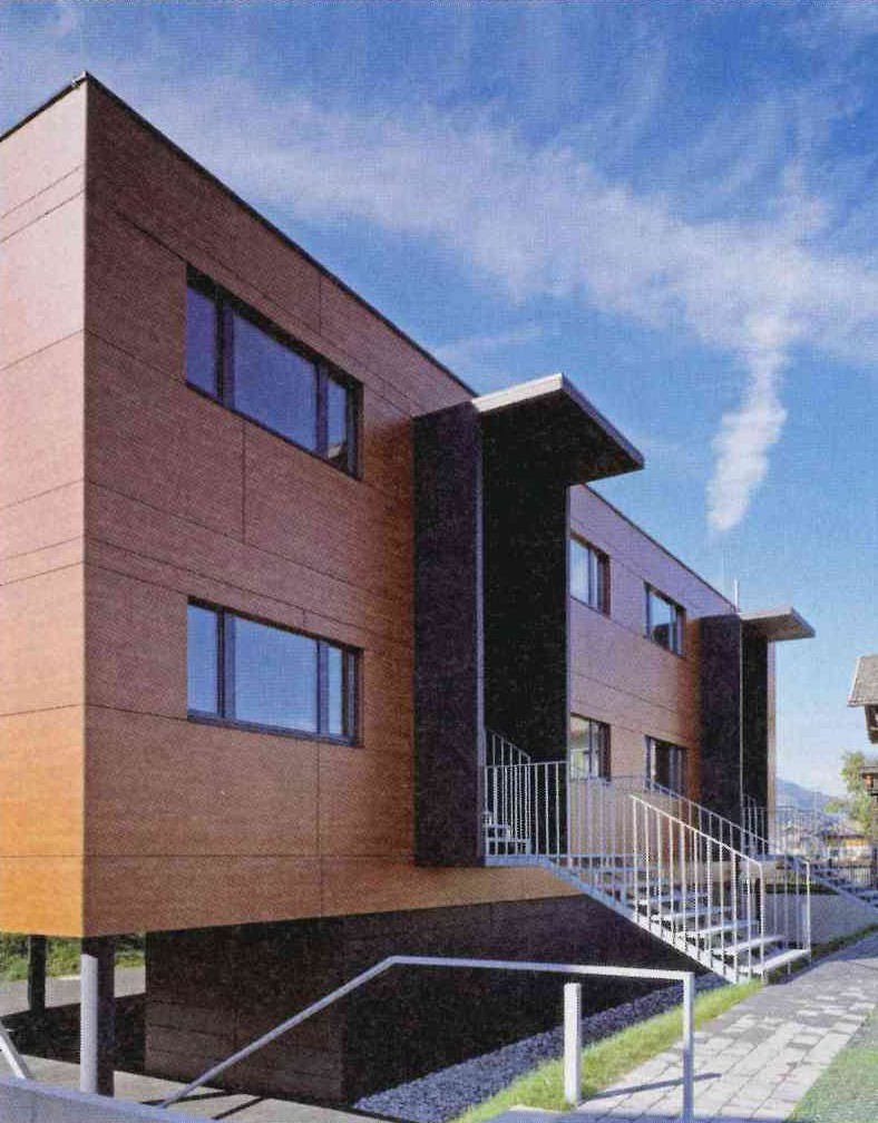 Die zweigeschossige vorgefertigte Holzriegelkonstruktion in Niedrigenergiebauweise ist an der Nord- und Südseite geschlossen gehalten, die Erschließung erfolgt über die Ostseite, während sich die Anlage mit großzügigen Fensterflächen und Balkonen nach Westen hin öffnet.