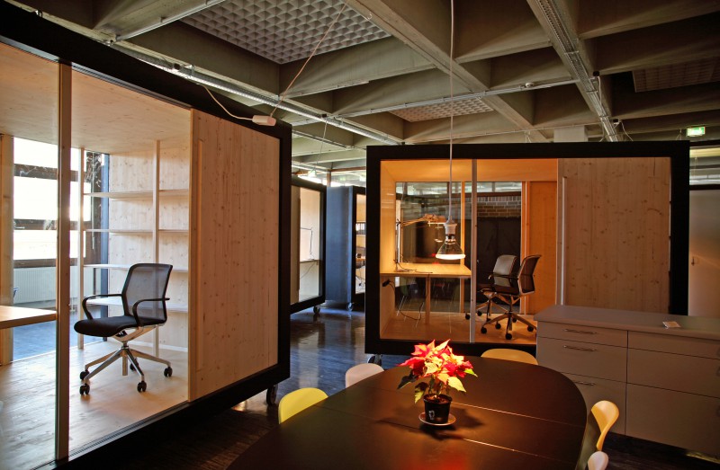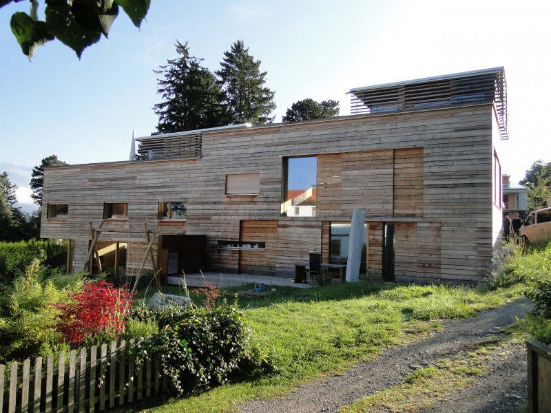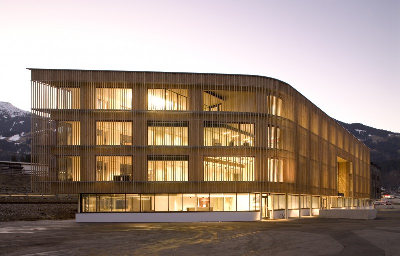 Holzbautechnisch ist das Gebäude ein vielfältiger, in jeder Hinsicht gelungener „Selbstversuch“. Das Untergeschoss und der Liftturm sind aus Stahlbeton, alle übrigen tragenden Teile aus Fichten-Brettsperrholzelementen.