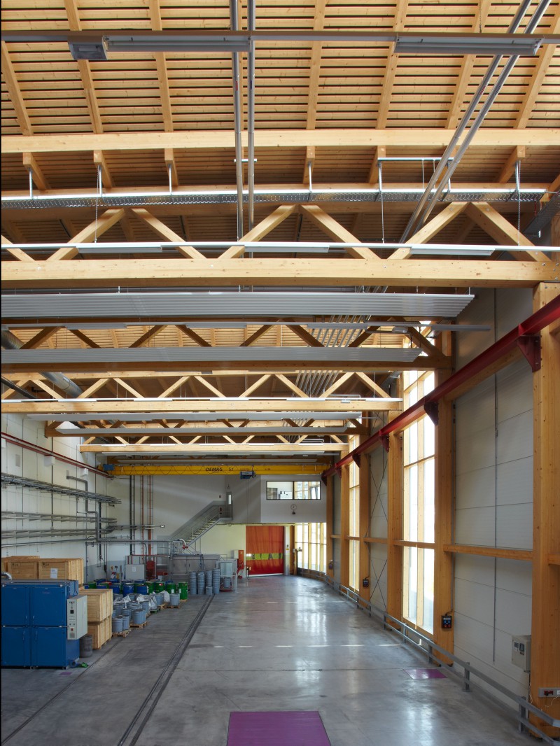 Bis zur Grenze des Machbaren wurden die hauseigenen bbs-Fertigteile ausgereizt, die Halle wurde mit stehenden, achsweise verstärkten Elementen realisiert, Fensteröffnungen ergeben sich aus Lücken in der statischen Konzeption der Wandflächen. Die Elemente wurden „netto“ verwendet, d.h. es gibt keine Fußbodenaufbauten und auch keine Wandverkleidungen, außer dort, wo sie unbedingt notwendig waren. Vorbildlich ist die pure Verwendung und gelungene Ausreizung des Produkts Brettsperrholz und der kontrollierte Grenzgang damit, um seine Eigenschaften im Nettozustand zu erproben.