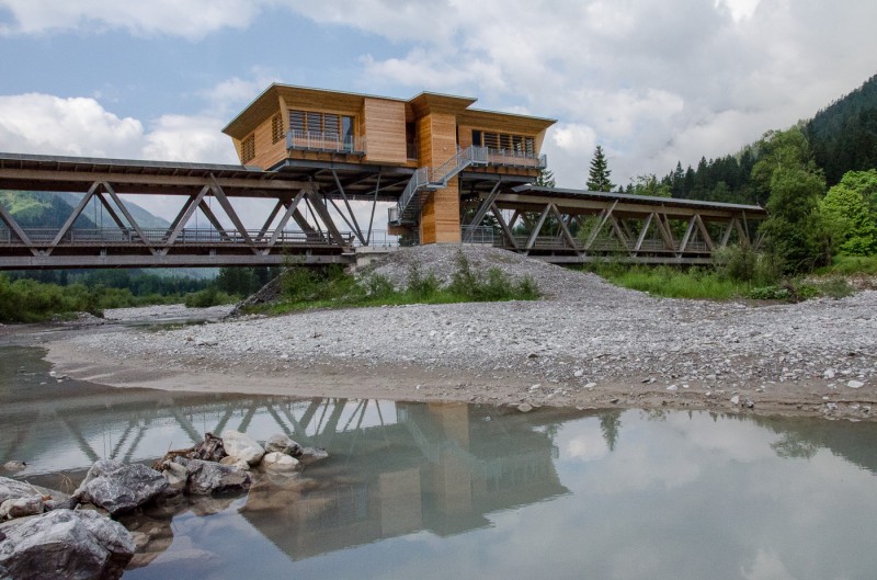 Bereits die ursprüngliche Klimmbrücke war als Holzfachwerk erstellt worden. Nach einem Hochwasser wurde eine Verdoppelung der Spannweite notwendig und für den neuen Brückenteil kam die gleiche Holzkonstruktion zum Einsatz. Im Bereich des neuen Mittelpfeilers wurden die Auflager für eine Stahlunterkonstruktion errichtet. Dieser Stahlbau dient als Fundament und Traggerüst für das über der Brücke liegende Naturparkhaus. Zu diesem „überragenden“ Holzbau führt als sichtbares Zeichen ein hölzerner Liftschacht. Die Vertikalerschließung ist wie die gesamte Holzkonstruktion mit einer Verschleißschicht aus Lärchenholz verkleidet. Die von der Witterung erzeugte graue Holzpatina bewirkt in Kombination mit dem extensiv begrünten Dach eine gelungene Integration in die Landschaft. Neben dem holzbautechnischen Ansatz und dessen Umsetzung besticht die Positionierung des Naturparkhauses über der Brücke. Die dadurch verhinderte Grundstücksverbauung im Naturschutzpark sowie die Erkennbarkeit des Stützpunktes und die neu geschaffene Aussicht zeugen von der hohen kreativen Qualität der Planung.