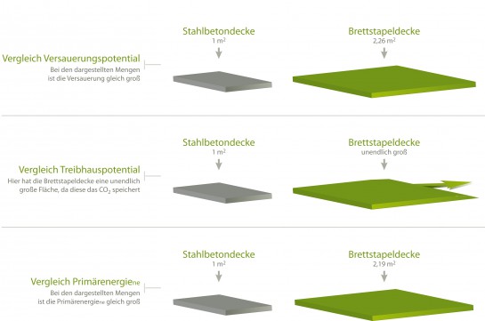 Die Produktion einer Brettstapeldecke mit einer Fläche von 2,26 m² verursacht in etwa dieselbe Versauerung wie die Herstellung einer Stahlbetondecke mit einer Grundfläche von lediglich 1 m². Ähnliches gilt bei der Betrachtung der nicht erneuerbaren Primärenergie. Holz leistet also keinen Beitrag zum Treibhauseffekt.
