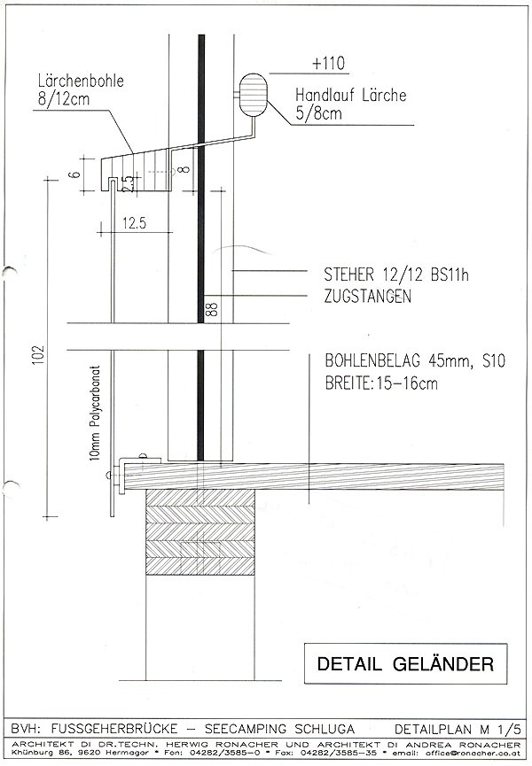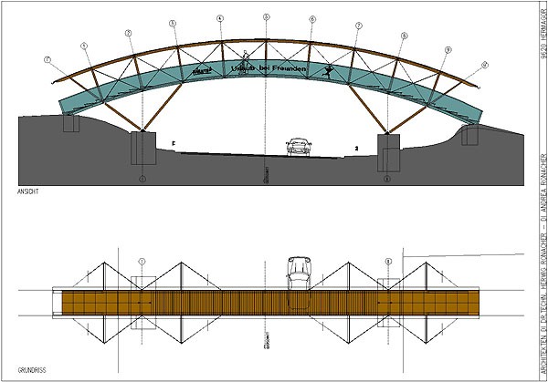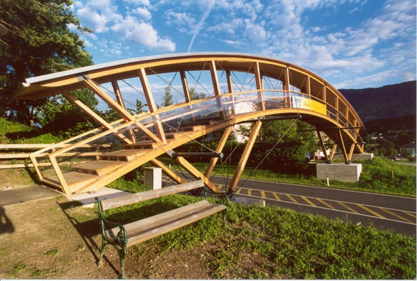 Die Besonderheit dieser Fußgängerbrücke liegt in der durch- und überdachten Konstruktion. Einerseits bildet die gesamte Brücke eine konstruktive Einheit, andererseits war es dadurch möglich, eine leichte und kostengünstige Brücke zu konzipieren. Durch die Überdachung ist zusätzlich ein konstruktiver Holzschutz in hohem Maße gegeben, was sich positiv auf die Lebensdauer der Brücke auswirkt. Um die Leichtigkeit der Brücke zu unterstreichen, aber auch aus Gründen des Witterungsschutzes, wurde das Brückengeländer in Polycarbonatglas ausgeführt.