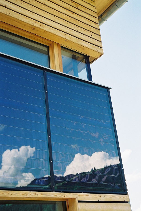 Der Baukörper orientiert sich klar nach Süden. Große Fensteröffnungen Richtung Süden, Westen und Osten. Aktiv wird die Sonne über 10,5 m² Fassadenkollektoren für Warmwasser und Heizung genützt.