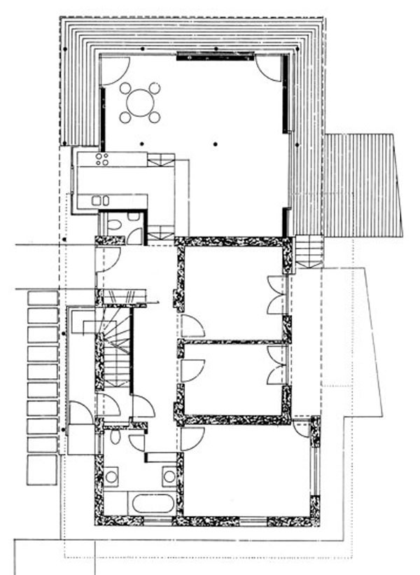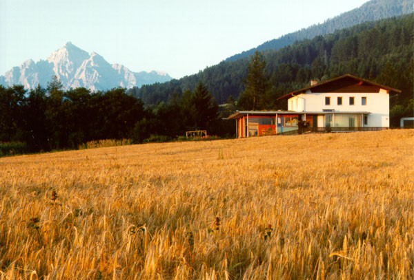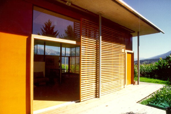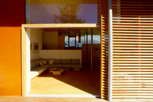 Konträr in Formensprache und Material zeigt sich der Zu- und Umbau des Mehrfamilienhauses A./F. in Raitis. Einzig eine horizontale Betonplatte bildet eine Verbindung beider Bauten. Die alte Ortbetonplattendecke wurde in derselben Schlankheit als Dach des Zubaues weitergeführt. Die rundum auskragende Platte ist auf 9 Stahlstützen gelagert und thermisch getrennt von der leichten lichtdurchfluteten Holzbox - ein Holzriegelbau mit Holzbalkenkonstruktion. Fensterflächen sind zu einem großen Teil Fixverglasungen, alle öffenbaren Elemente sind holzgerahmt. Schiebeläden aus Lärchenholzlamellen filtern das einfallende Sonnenlicht.