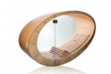 Konstruktion: Die Kabine besteht aus einer Rhombus-Form, aufgeschwartet in Zirbe mit Sägeschnitt Oberfläche und Meanderbandfräsung. Die Infrarotstrahler sind alle flächenbündig eingefräst, ebenso das Bedienpaneel, ...