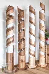 Bei der Fertigung werden Furniere ausgewählt, dann werden die einzelnen Blätter in Schichten mit Leim aufgetragen und anschließend mit einer selbst gebauten Lehre spiralförmig nach oben gewickelt und verpresst. Nach ...