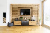 Wohnzimmer mit Wohnwand und Leseecke in sonnenverbranntem Altholz und gehackten Balken. Sideboard und Bücherregal in Eiche massiv.