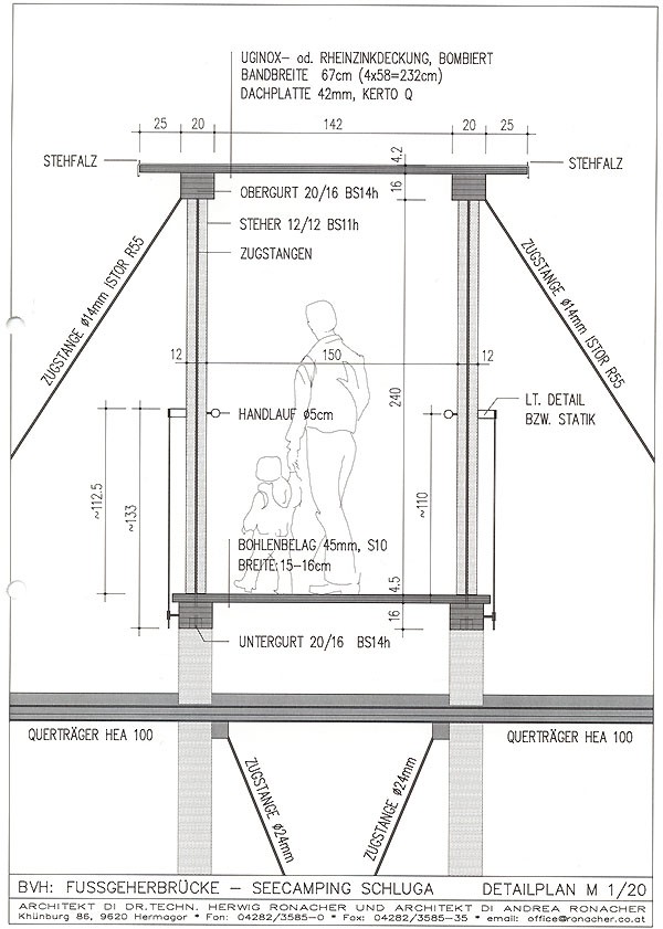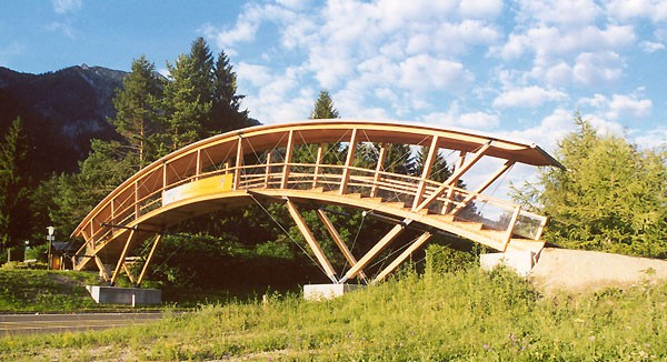 Die Besonderheit dieser Fußgängerbrücke liegt in der durch- und überdachten Konstruktion. Einerseits bildet die gesamte Brücke eine konstruktive Einheit, andererseits war es dadurch möglich, eine leichte und kostengünstige Brücke zu konzipieren. Durch die Überdachung ist zusätzlich ein konstruktiver Holzschutz in hohem Maße gegeben, was sich positiv auf die Lebensdauer der Brücke auswirkt. Um die Leichtigkeit der Brücke zu unterstreichen, aber auch aus Gründen des Witterungsschutzes, wurde das Brückengeländer in Polycarbonatglas ausgeführt.