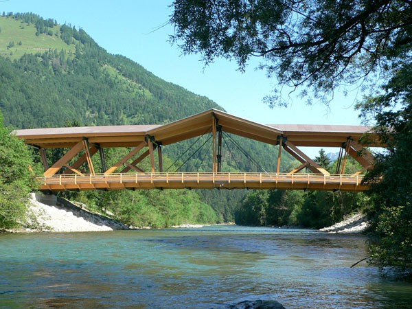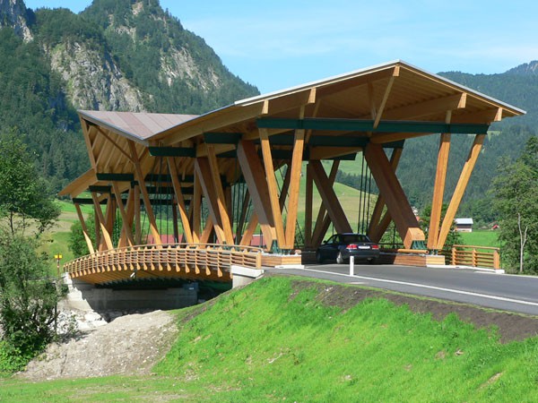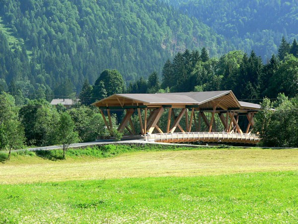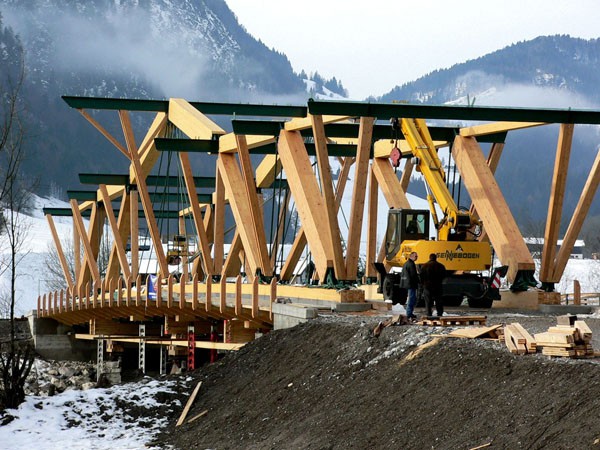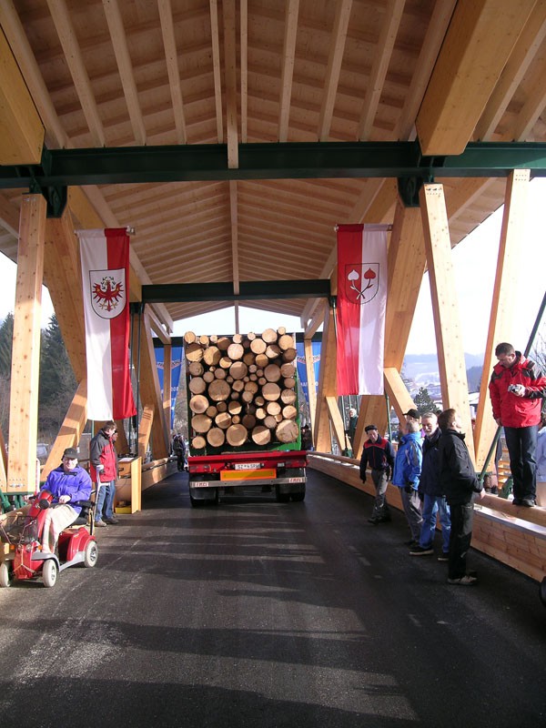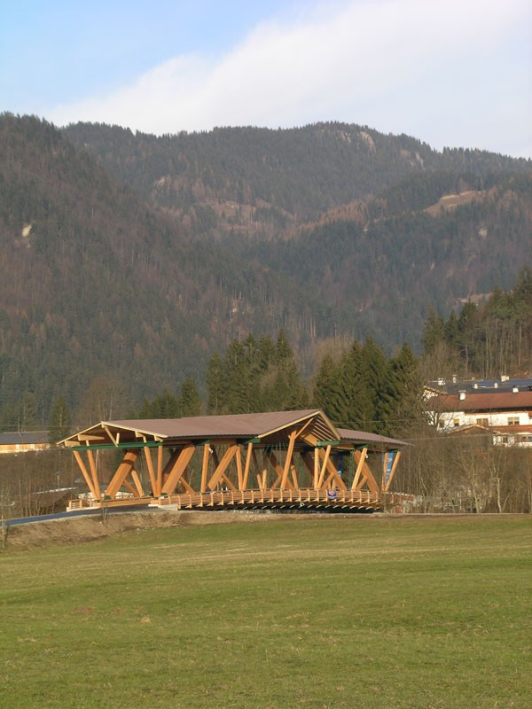 Die Holzbrücke in Kössen/Tirol zählt zu den größten Straßenbrücken aus Holz in Europa. In einer Bauzeit von weniger als 4 Monaten wurde eine zweispurige Straßenbrücke der Brückenklasse I mit einer Spannweite von 50,4 m errichtet. Diese sogenannte Staffenbrücke über die Grossache ist das letzte Brückenbauwerk auf Tiroler Boden über die Grossache und verbindet das Ortszentrum von Kössen mit den Weilern Erlau/Staffen sowie den neu errichteten Siedlungen in diesem Bereich. Bis 1911 bestand an dieser Stelle nur ein schmaler Steg, bevor eine einspurige Holzbrücke errichtet wurde und im Jahre 1982 mit einem Gehsteig ergänzt wurde. Die Brücke mit 3 Mittelpfeilern stellte ein wesentliches Hindernis für den Hochwasserabfluss an der Grossache dar (siehe Hochwasser vom August 2002). Daher wurde vom Amt der Tiroler Landesregierung, dem Baubezirksamt Kufstein und der Wasserwirtschaft ein Tragwerk ohne Flusspfeiler gefordert. Das Haupttragsystem ist nun eine Fachwerkkonstruktion aus Brettschichtholz (teilweise in Lärche) mit Zuggliedern aus Stahl und einer freien Spannweite von 50,4 m. Um die Tragkonstruktion vor direkter Bewitterung zu schützen, ist die gesamte Brücke überdacht. Für die Planung und statische Bearbeitung zeichnete sich das ZT-Büro Hofmann+Resch+Exenberger, beraten durch Univ. Prof. DDI Michael Flach, Holzbaulehrstuhl Universität Innsbruck, verantwortlich.