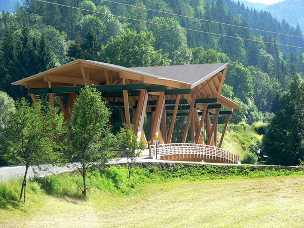 Das Haupttragsystem ist eine Fachwerkkonstruktion aus Brettschichtholz (teilweise in Lärche) mit Zuggliedern aus Stahl