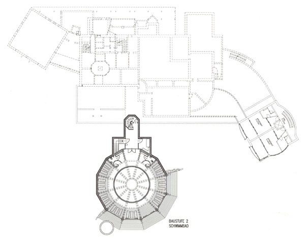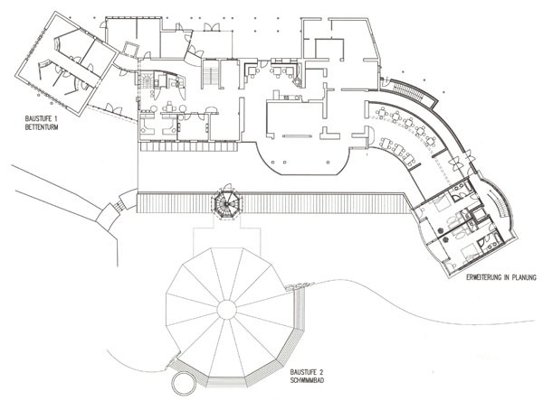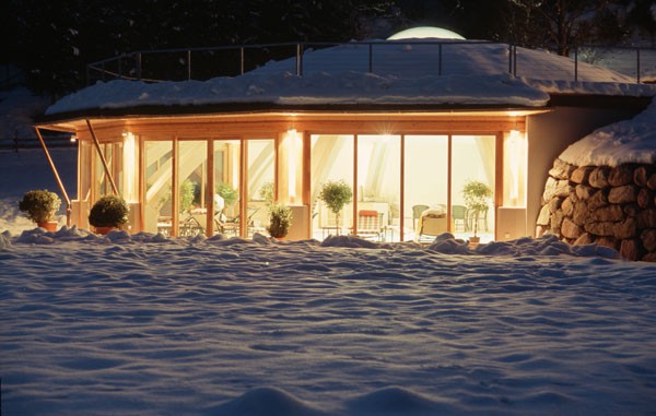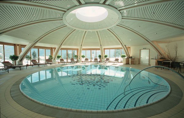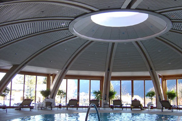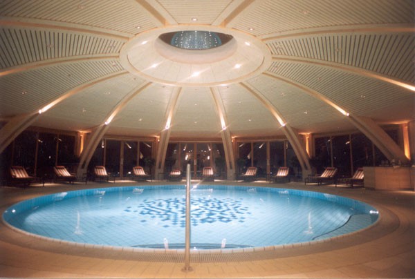 Der bestehende Wellnessbereich des Biohotels Daberer sollte nach Süden hin erweitert werden. Das neu zu errichtende Schwimmbad wurde in Zwölfeckform mit einer Holzkuppel errichtet. Fünf Flächen dieses Zwölferpolygons wurden großzügig nach Süden und Südosten verglast. Schiebeelemente ermöglichen das großflächige Öffnen des Raumes. Ein rundes Oberlicht in der Mitte der Holzkuppelkonstruktion sorgt als zusätzliche Lichtquelle für stimmungsvolle Beleuchtung. Die Kuppel wurde in Form einer Leimholzkonstruktion mit Holzpaneelen ausgeführt. Das Gründach der Kuppel sorgt für erstklassige bauphysikalische Daten und gleichzeitig für eine Einbindung in den Naturraum.