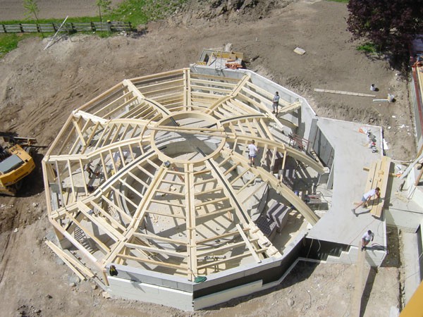 Zwölf zweiteilige und strahlenförmig angeordnete Brettschicht-Holz-Bogenbinder bilden das Primärtragwerk der Kuppel