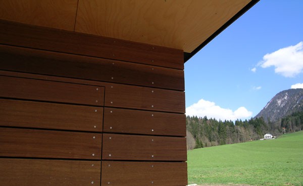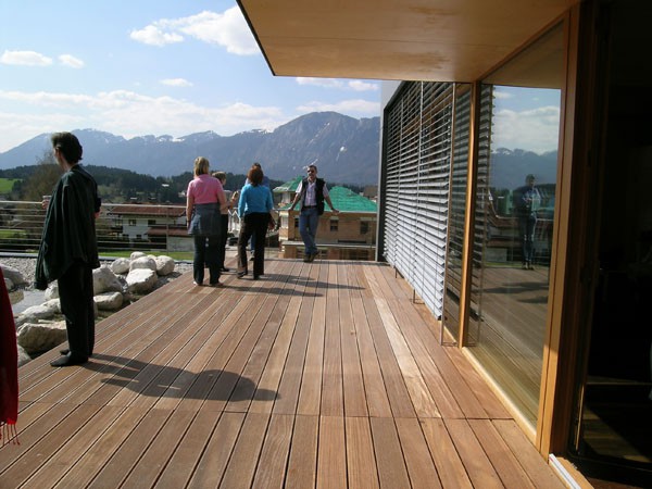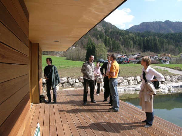 Das Passivhaus in Holzbauweise in Bad Häring zeigt im Innenraum ein Spiel mit unterschiedlichen Holzsorten. Dunkle Eichenböden setzen einen Kontrast zu den hellen Birkensperrholzplatten an Wand und Decke. Heller Lehmputz und farbkräftige melaminharzbeschichtete Holzwerkstoffplatten setzen Akzente. Wasser und Holz werden im Außenbereich zum Thema. Die Holzterrasse scheint nahtlos in den Schwimmteich überzuleiten und vermittelt südländischen Lebensstil.