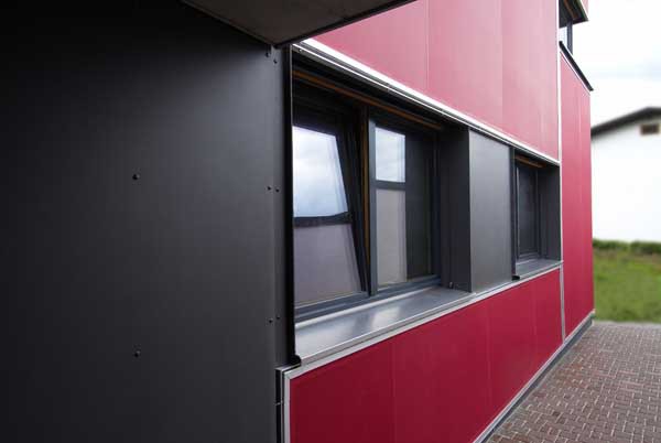 Lärchenschalung, Textilbespannung: weinroter Polyesterstoff bzw. Eternight
