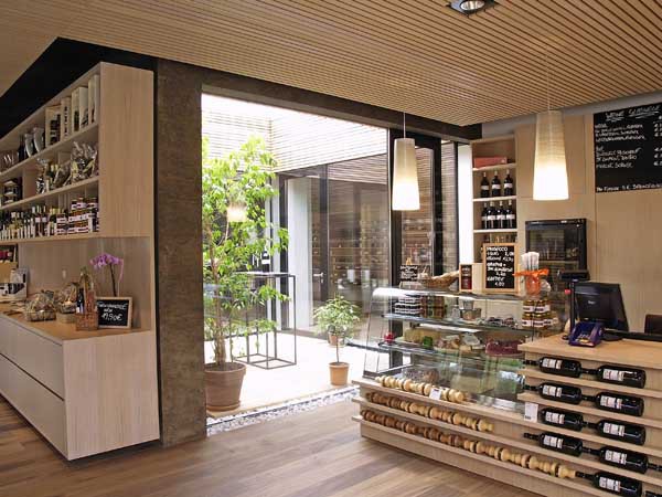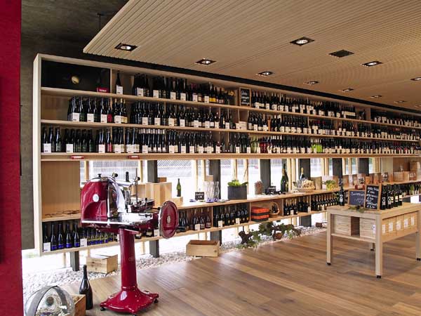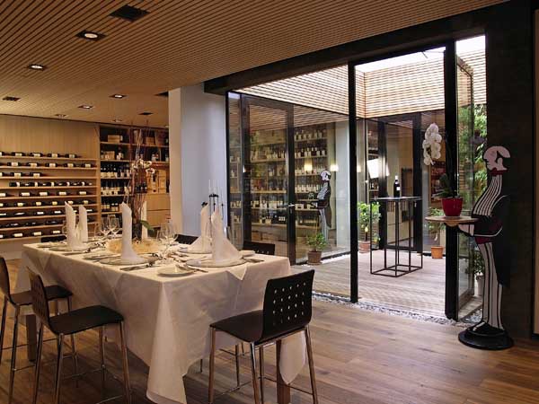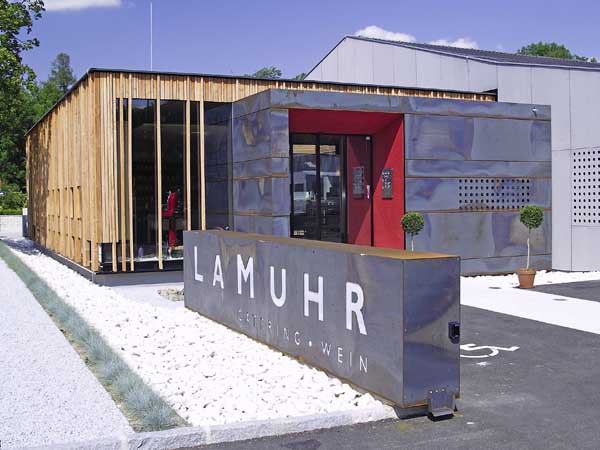 In unmittelbarer Nähe zur Bundesstraße gelegen sorgt die Vinothek la Muhr durch einen Lichthof für eine Ruhefläche im Freien. Nach außen geschlossen, nach innen geöffnet: Der Grundgedanke für die Planung.