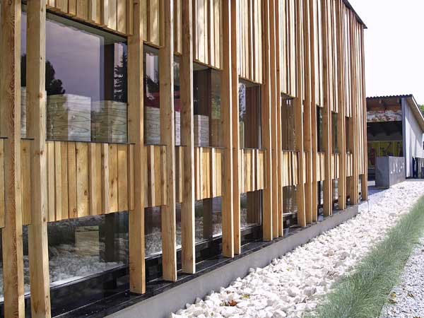 Besonders wichtig war die Auswahl und Anordnung der verwendeten Materialien - manche haben auch eine symbolische Bedeutung. Zum Beispiel soll die durch die naturbelassene sägerauhe Holzschalung gegebene Verwitterung der Fassade an die Reifung guten Weines erinnern: Mit der Zeit erhält das Holz seinen eigenen Charakter. Aus dem gleichen Grund wurde für die Eingangsfassade Cortenstahl als Material ausgewählt: Nach und nach entwickelt es eine schützende Rostoberfläche.