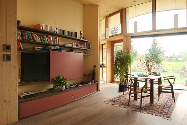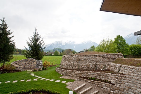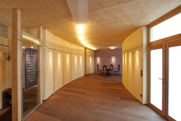 Für den Bau wurden fast ausschließlich Naturmaterialien verwendet, so beherrschen Holz, Lehm und Naturstein das gesamte Objekt. Das Projekt zeigt eindrucksvoll, wie mit Holz in Verbindung von Lehm auch gekrümmte Wandflächen ausgeführt werden können. Das geneigte und begrünte Dach der Villa spannt sich bis zu 8 m frei als kreuzlagenverleimte Platte unterzugsfrei.