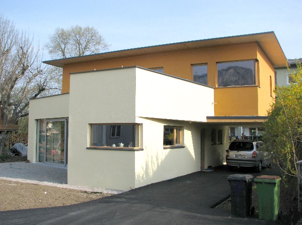 Ein Architektenhaus zum Preis eines Fertighauses. Der Wunsch der Familie Schwarzmann war eine individuelle Planung von Geistlweg-Architektur zum Preis eines in der Größe vergleichbaren Fertighauses. Wenn möglich sollte es ein Holzbau mit ca. 130 m² Nutzfläche sein. Holzwärmegedämmte Holzbau Elemente in Fertigteilbauweise sowohl als Ständerbau als auch aus massiven Brettstapelwänden. Die Ständerwände wurden mit Fermacell Platten verkleidet, die Brettstapelwände blieben sichtbar. Die Deckenelemente über EG und das Dach sind Massivholz-Brettstapeldecken mit Holzuntersicht. Die Vordächer des Hauptdaches und die Decke über dem Carport wurden in Kreuzlagenholz mit fertiger Holzuntersicht hergestellt. Diese Ausführung ist gegenüber einer herkömmlichen preislich und optisch überlegen.