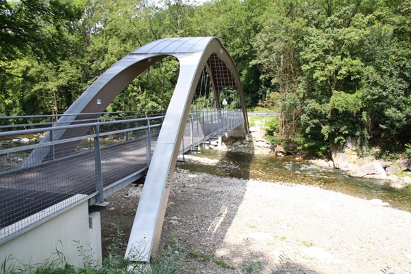Diese Fuß- und Radwegbrücke (NKL I) mit einer Spannweite von 40 m (b=2,50 m) ist als Bogenbrücke mit abgehängter Fahrbahn ausgeführt. Die Bogenträger sind aus Lärchen-Brettschichtholz, die Fahrbahnplatte besteht aus Fichten-Brettsperrholz mit bituminöser Abdichtung und Asphaltbelag. Die Bögen inkl. Dach aus Fichten-Dreischichtplatten wurden in zwei Teilen und die Fahrbahnelementen inkl. Geländer in vier Teilen vorgefertigt. Die Montage erfolgte mit zwei Kränen und zwei Hebebühnen in nur zwei Tagen. Das Projekt wurde mit einem Sonderpreis für die konstruktive Ausführung beim NÖ Holzbaupreis 2009 ausgezeichnet.