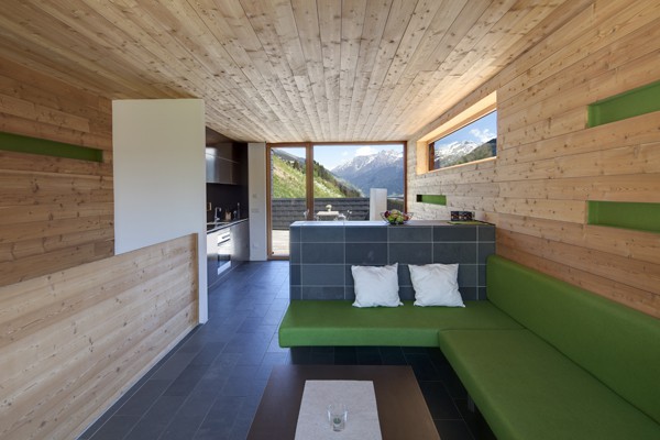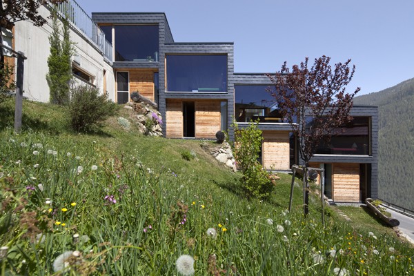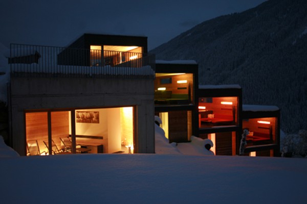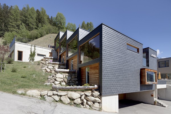 Die Apartments liegen im Tiroler Gebiet der Silvretta. Der Name "aradira" stammt aus dem räteromanischen Sprachgebrauch und bedeutet wörtlich übersetzt Ackerland. Dies entspricht der früheren Nutzung dieses Grundstückes. Das Gebäude schmiegt sich treppenförmig entlang des Hanges und ermöglicht somit für alle 4 Apartmenteinheiten einen ungestörten Blick in die Natur. Gleichzeitig wird dadurch ein Maximum an Privatsphäre für die Bewohner der einzelnen Wohneinheiten gewährt. Bei der Tragkonstruktion, Dämmung und Materialisierung des Gebäudes wurde größter Wert auf natürliche Materialien gelegt. Das gesamte Traggerippe der Wände und Decken ist als Holzskelettbauweise ausgeführt. Als Wärmedämmung der Außenhülle und Zwischendecken kam Mineralwolle zum Einsatz. Die Außenfassade der Längsachsen wurde als hinterlüftete Fassade mit natürlichem Schiefer (25,0 x 35,0 cm) ausgeführt. Die geschlossenen Außenflächen der Querachsen sind mit rohen Dreischichtplatten in Lärche verkleidet. Bei der Wand- und Deckenverkleidung im Inneren kam eine unbehandelte Lärchenschalung zur Anwendung. Die natürliche Belichtung des Gebäudes erfolgt über große Fensterflächen im Obergeschoss, welche über die Querwände die Natur und das imposante Bergpanorama in den Raum zu holen scheinen. Auf der Eingangsebene werden die Schlafzimmer ebenfalls über die Querwände belichtet. Während der Wintermonate werden so die Wohnungen durch die Sonneneinstrahlung aufgeheizt und garantieren dadurch einen minimalen Einsatz der Heizung. Während der Sommermonate gewährleistet der Sonnenschutz an der Westseite ein notwendiges Beschatten und verhindert eine Überhitzung der Räume. Das Bauwerk ist als Niedrigenergiehaus konzipiert. Die Erdwärmepumpe liefert die notwendige Energie für die Heizung und das Warmwasser. Als Energieverteilung dient die Fußbodenheizung und die Kachelöfen, welche über das Warmwasser und über eine Holzfeuerung gespeist werden.
