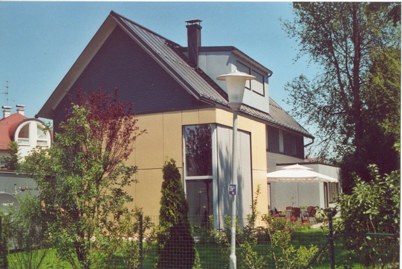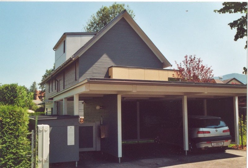 Das Einfamilienhaus Hofer mit Bürobereich in Salzburg entspricht dem Niedrigenergiehausstandard und wird mittels Erdwärme beheizt. Die Dachstuhlelemente wurden im Zimmereibetrieb vorgefertigt und per Kran vor Ort montiert.