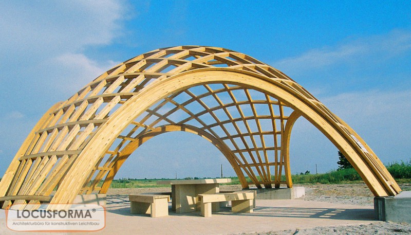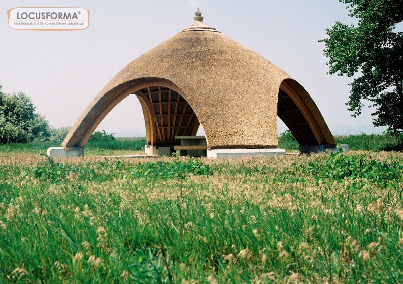 Die Holzgitterschale dient als Rastplatz und Unterstand für den Radweg B10 am Neusiedlersee. Mit der sanften Schalenform fügt sich der Pavillon in die Umgebung ein. Der Innenraum bietet Schatten und Sitzgelegenheiten und interessante Ausblicke in die Umgebung. Die Holzgitterschale ist in Brettstapelbauweise realisiert und aus lauter unbehandelten, einzelnen Brettern vor Ort aufgebaut worden. Mit der Schilfdeckung wurde regionaler Rohstoff für die Eindeckung verwendet und gleichzeitig eine Methode angewendet, mit der die Schalenuntersicht unverändert erhalten bleibt. Die Holzkonstruktion erreicht mit ihrer Krümmung die Grenze welche mit Holzlatten in dieser baulichen Dimension möglich ist und stellt dabei dennoch eine stabile und tragtaugliche Konstruktion dar.