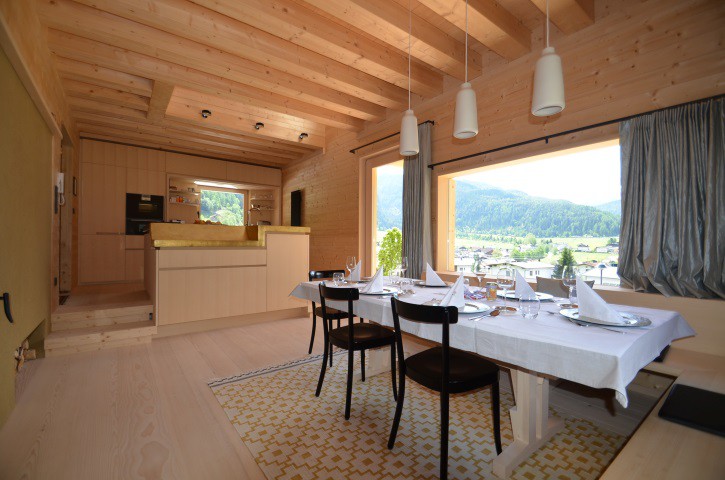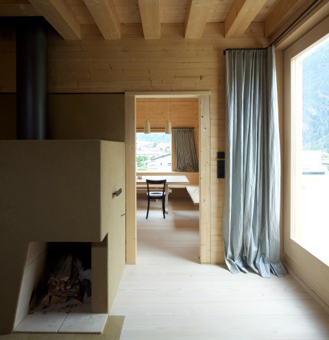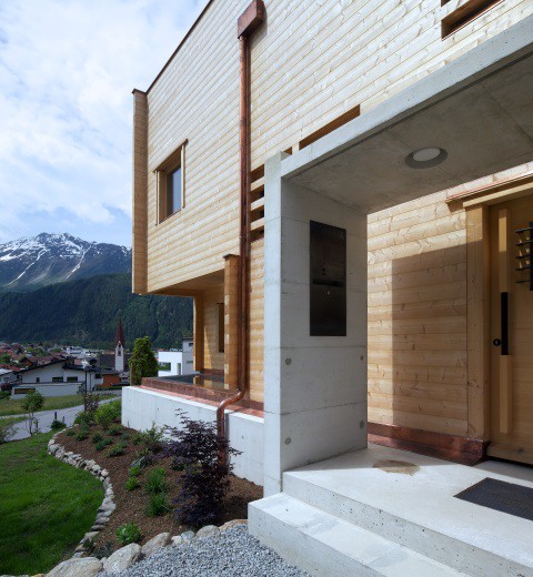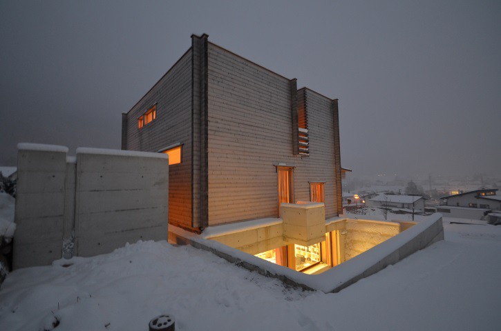 KURZSTATEMENT: "anders als geWohnt" ist die Art der Ausführung dieses Büro-/Wohnprojektes am Land, welches in archaischen Materialien umgesetzt wurde. Der Wohnbereich in neu interpretierter, traditioneller Massivblockbauweise. Das Atelier in hell gefärbtem Sichtbeton. ARCHITEKTENZITAT: Die räumlichen Anforderungen waren die Schaffung von Wohnraum für eine vierköpfige Familie und ein Architekturbüro mit vier vollausgestatteten Arbeitsplätzen. Dies Alles auf geringer Grundstücksfläche und im Rahmen der Vorgabe einer offenen Bebauung. Die emotionalen Vorgaben waren die Verwendung von natürlichen Baustoffen, welche handwerklich durch Firmen in der nahen Umgebung verarbeitet werden. Eine weitere, selbst auferlegte, Vorgabe war das Material unverfälscht einzusetzen und das Natürliche des Materials zu erhalten und sichtbar zu machen. Sämtliche Oberflächen, beginnend beim Sichtbeton bis hin zu den Holzblock- und Möbeloberflächen, sind vollständig unbehandelt. Einzige Ausnahme ist der Holzriemenboden, welcher weiß geseift wurde. Der Alterungsprozess des gesamten Gebäudes wird somit sichtbar gemacht. Die äußere Gebäudehülle wird sich stetig verändern und altern, ebenso die inneren Oberflächen, welche immer stärker werdende Abnützungen aufweisen werden. Dadurch lebt das Gebäude und ändert sich stetig im Lauf der Zeit bis hin zu einem heute nicht bekannten Ablaufdatum. Die Veränderung ist ein bewusst eingesetztes Mittel der Gestaltung. Der stetige Wandel ist wesentlicher Teil unseres Lebens und Arbeitens.