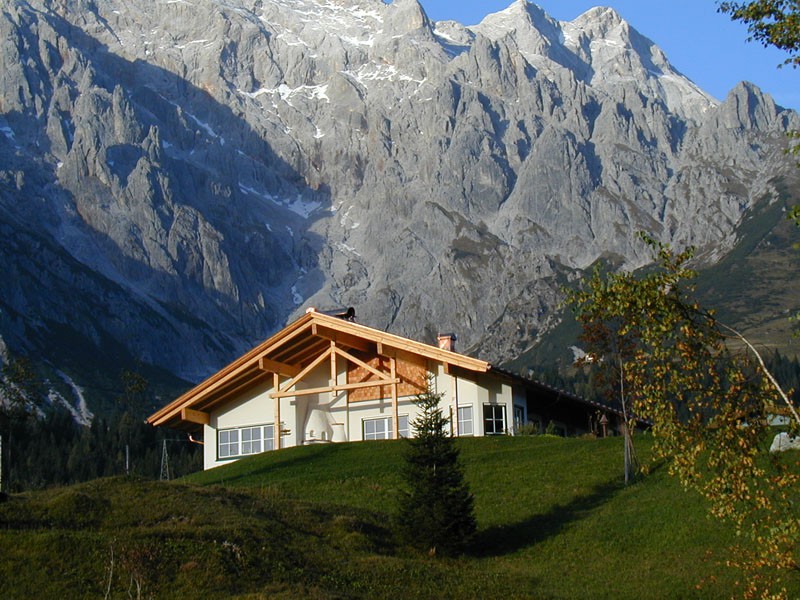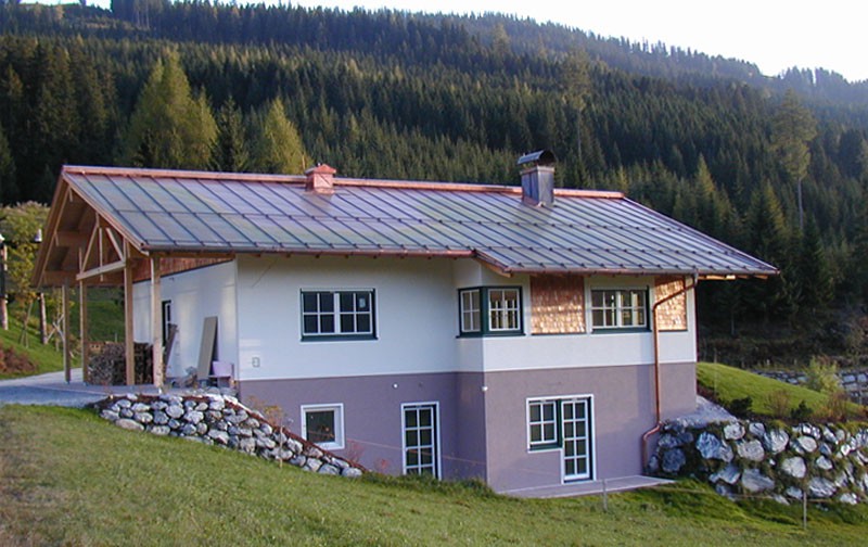 Das Einfamilienhaus der Familie Burgschwaiger befindet sich in alpiner Lage am sonnigen Plateau am Hochkönig. Der Sichtdachstuhl aus Holz verleiht dem Innenraum Holzatmosphäre. Eine Schindelfassade aus Lärche schützt die Nordfassade.