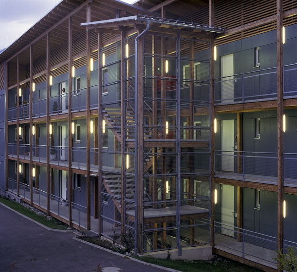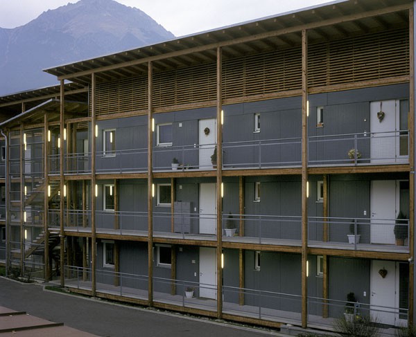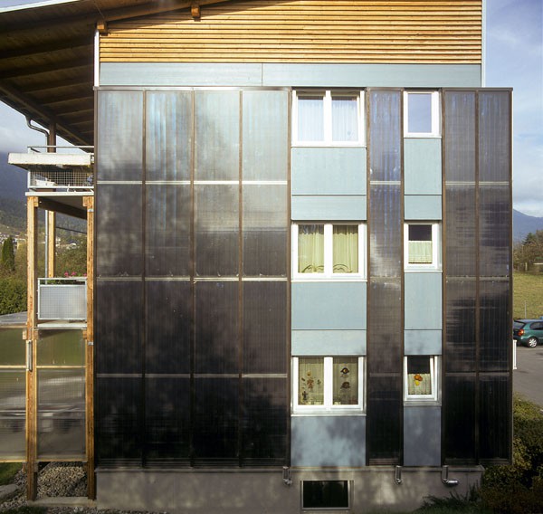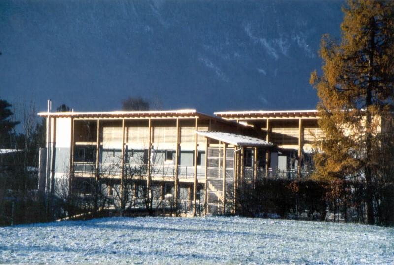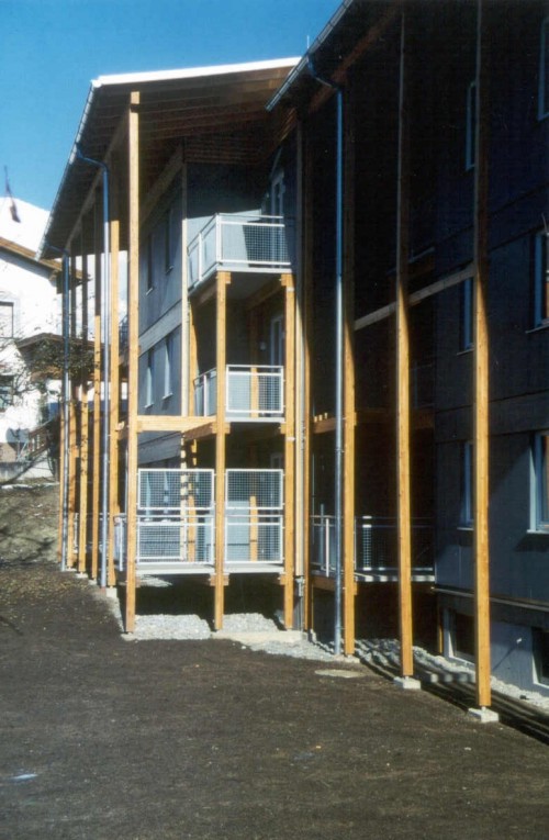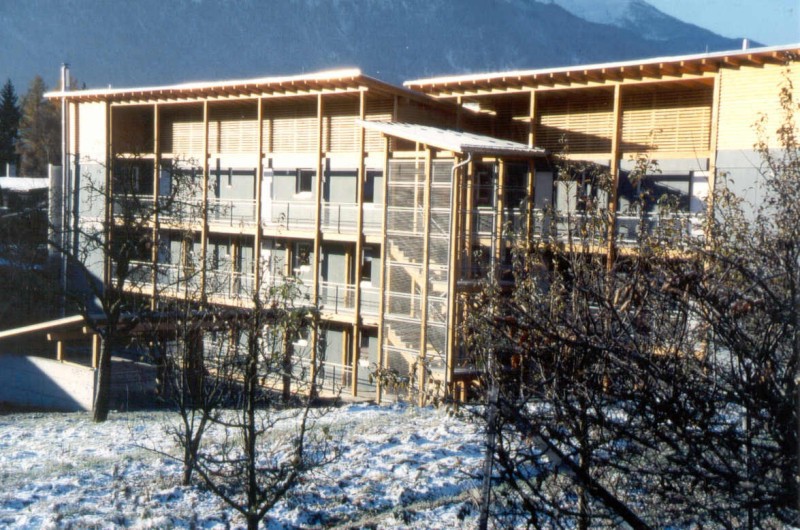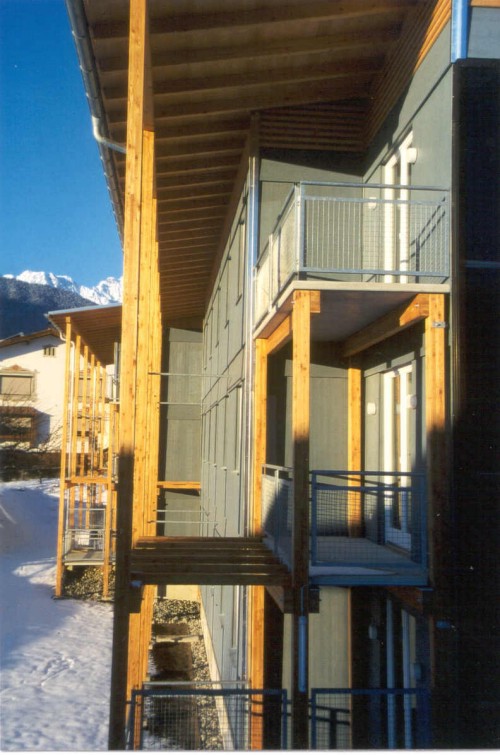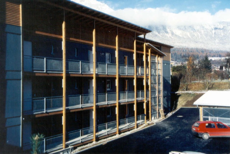 Dieser Wohnbau ist das erste dreigeschossige Mehrfamilien-Wohnhaus in Tirol, dass in Holzbauweise errichtet wurde. 18 Wohneinheiten werden über ein offenes, extern angebrachtes Stiegenhaus mit Laubengängen an der Ostseite des Hauses erschlossen. An der Westseite sind eingezogene und somit blickgeschützte Balkone angeordnet. Die Südfassade ist zur Gänze mit senkrecht angeordneten, in der Fassade integrierten Sonnenkollektoren verkleidet. Die Holzfassade ist hinterlüftet und mit großen, blau lasierten Fichten-Dreischichtplatten verkleidet. Das flachgeneigte Pultdach ist mit einer Blechdeckung versehen. Die Laubengänge und Balkone sind aus Erhaltungsgründen aus Betonfertigteilen auf einer Lärchenunterkonstruktion gefertigt. Die Decken über EG und 1.OG sind aus schallschutztechnischen Gründen aus Betonfertigteilen hergestellt. Zwischen den Wohnungen ermöglichen durchgehende Gebäudefugen einen optimalen Schallschutz. Der Energiebedarf für die Heizung dieses Niedrigenergiegebäudes wird durch eine Pelletsheizung abgedeckt, die Warmwasserbereitung erfolgt zusätzlich über eine Solaranlage (alternativ auch elektrische Aufbereitung möglich).