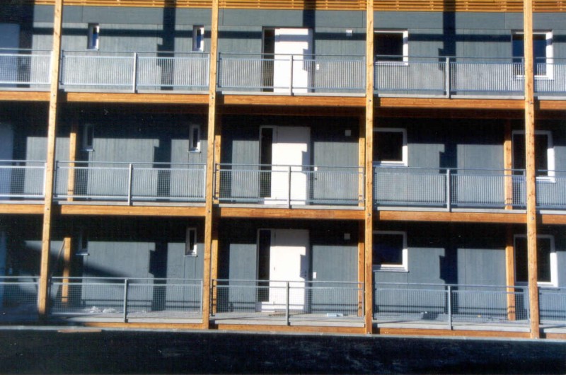 Wände in Holztafelbauweise, Decke über EG und 1.OG aus Stahlbetonfertigteilen, Balkon und Laubengang aus Betonfertigteilen.