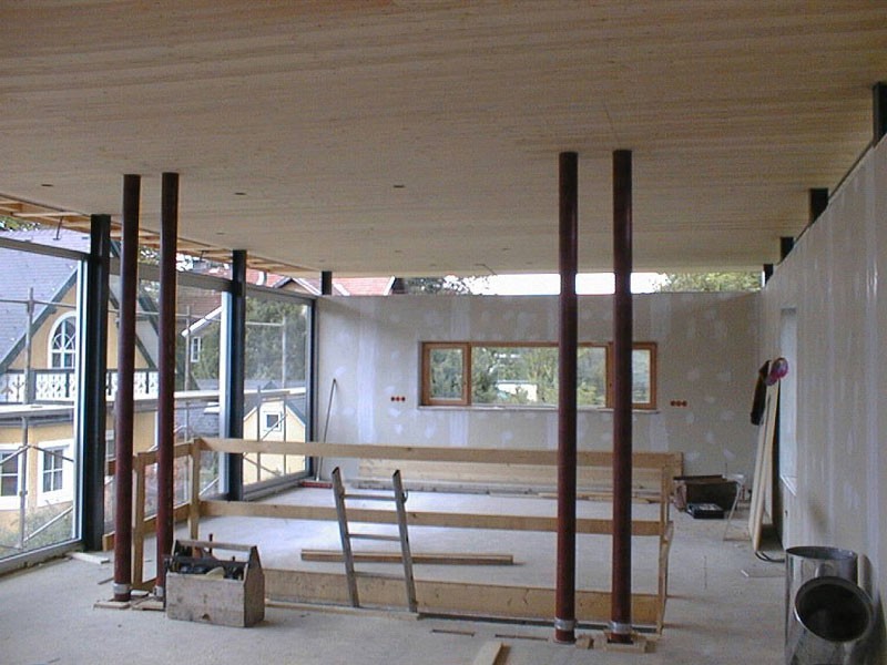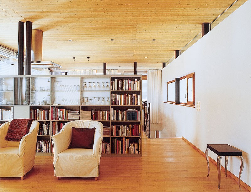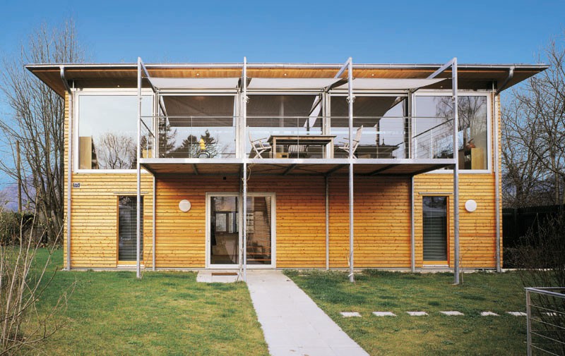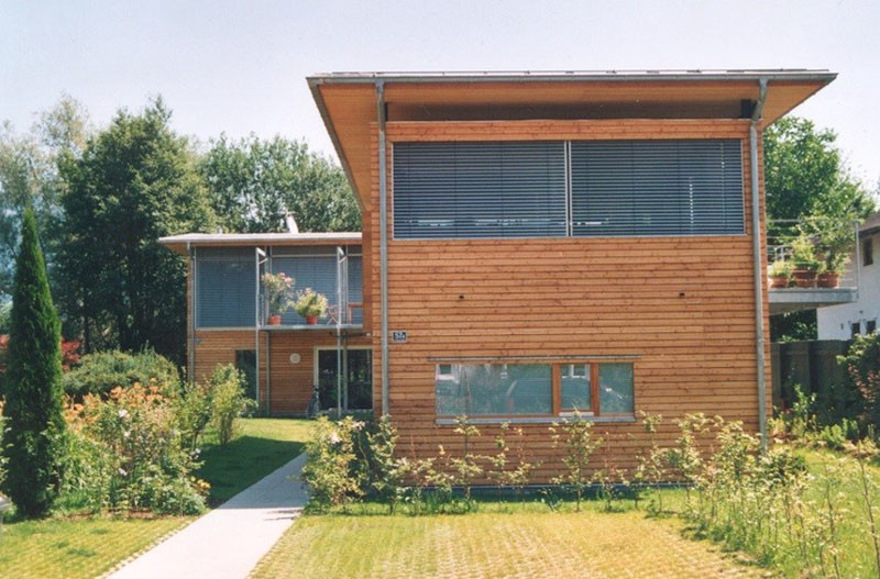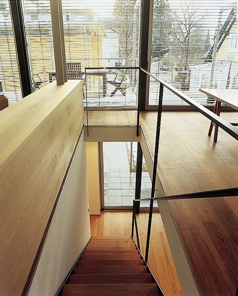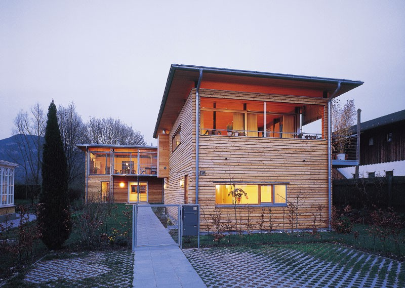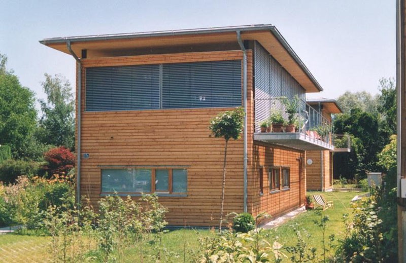 Der Typus städtische Villa wird hier in einer modernen, zeitgemäßen Bauvariante gezeigt und bekommt durch den Werkstoff Holz eine besondere Note. Die Konstruktion stellt eine Kombination aus Holzrahmenbau und Skelettbau - durch Stahlstützen ergänzt - dar und wurde in überzeugender Weise umgesetzt.