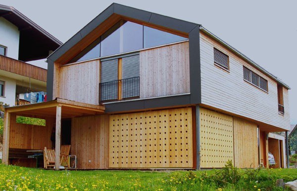 Der Einsatz diverser Holzwerkstoffplatten in Komposition mit einer Stülpschalung aus Lärchenholz setzt gestalterische Akzente. Die Energieversorgung erfolgt mittels einer Solaranlage und einer Pelletsheizung.