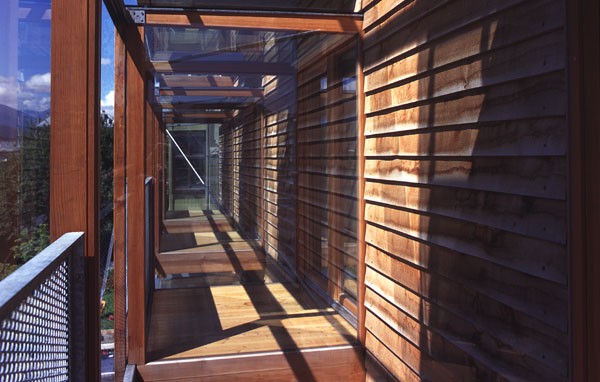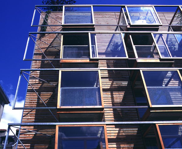 Der mehrgeschossige Wohnbau in der Höttinger Au in Innsbruck zeigt eine Kombination der Baustoffe Holz und Beton. Vorgefertigte Wandteile als verlorene Schalung mit Dämmung und äußerer Stülpschalung in Eiche wurden auf der Baustelle mit Recyclingbeton ausgegossen. Der Beton erfüllt die Kriterien von Statik, Schall- und Brandschutz und dient als Speichermasse. Der Baustoff Holz bestimmt die Ästhetik sowohl im Außen- wie auch im Innenbereich.